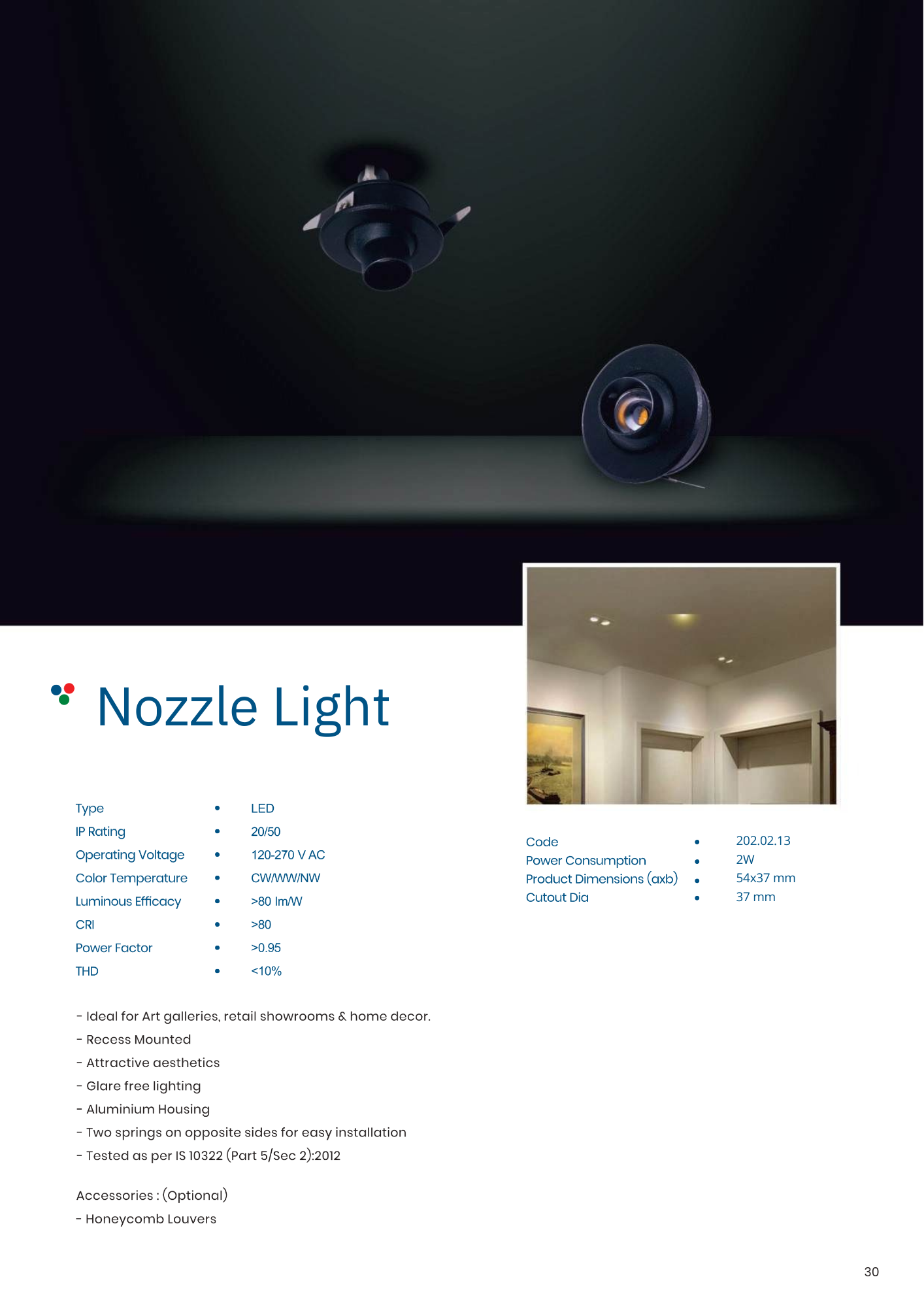 Nozzle light is a low heat light for art galleries, retail showrooms and home decor. It is recessed and has attractive aesthetics. Type COB IP Rating 20 Operating Voltage 230 V AC Color Temperature CW/WW Luminous Efficacy >120 lm/W CRI >80 Power Factor >0.95 THD <10%     Code  202.01.13 Power Consumption 2W Total Luminous 240 lm Product Dimensions (axb) 45 x 47 Cutout Size (mm) 37